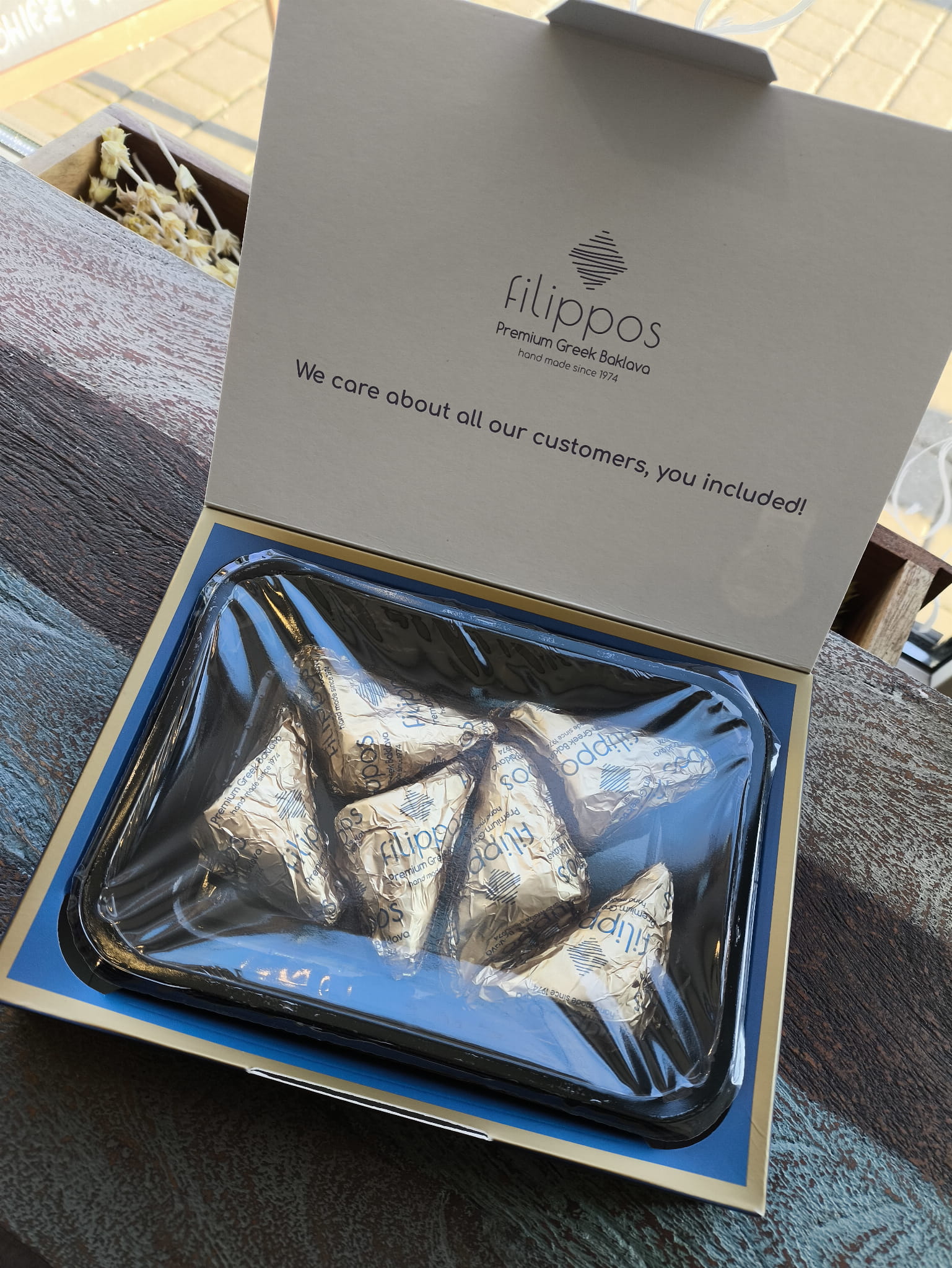 Wytwarzana jest ręcznie przez rodzinny zakład Filippos. Ten wyjątkowy przysmak łączy tradycję z nowoczesnością. Każdy kawałek to harmonijne połączenie chrupiących warstw ciasta filo, orzechów, aromatycznego syropu oraz wyśmienitej czekolady.