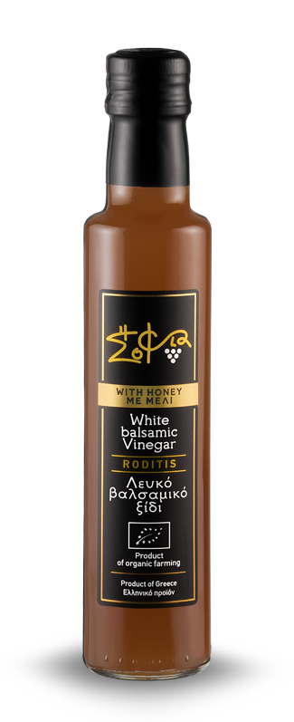 Połączenie białego octu winogronowego z rodzimej odmiany Roditis i wiosennego miodu wrzosowiskowego, delikatnie zebranego od pszczelarzy na zboczach góry Pindos jest sekretem tego wyjątkowego, dobrze zbalansowanego przysmaku. Łączy wszystkie aromaty i smaki greckiej wsi w butelce. Rezultatem jest wybuchowa kombinacja aromatów i smaku, która urozmaici słodko-kwaśne sosy, świeże sałatki i marynowany drób.