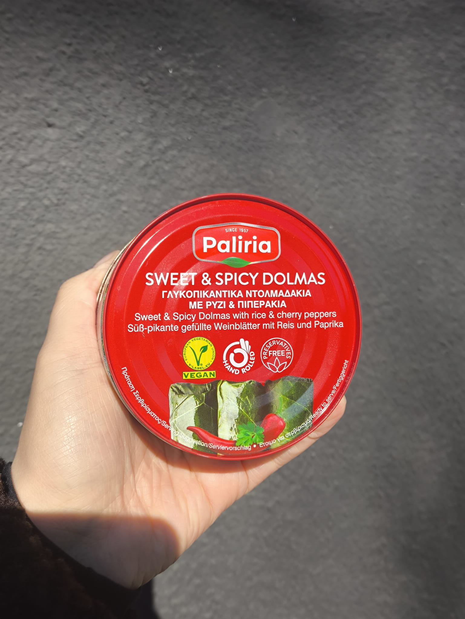 Słodko-pikantna Dolma z ryżem i papryką jest idealna dla tych, którzy eksperymentują z różnymi smakami, odchodząc od tradycyjnych. To połączenie przenosi przepis na wyższy poziom, dzięki czemu Paliria Dolma jest popularna na całym świecie, słynąc ze swojego smaku i aromatu. W Paliria's Sweet and Spicy Dolma, delikatny ryż jest najpierw dobrze ugotowany z posiekaną cebulą, pietruszką i małymi, słodkimi i pikantnymi papryczkami, które wzmacniają smak farszu! Następnie jest on mistrzowsko zawijany przez naszych doświadczonych kucharzy, w delikatne liście winogron z wczesnych zbiorów. Słodko-pikantna Dolma Paliria's z ryżem i papryką to doskonała alternatywa, nowoczesna przekąska! Można je jeść na gorąco lub w temperaturze pokojowej. Inni wolą je z orzeźwiającym sosem jogurtowym, a inni bez niczego dodatkowego. Dla koneserów jednak to danie idealnie pasuje z tsipouro!