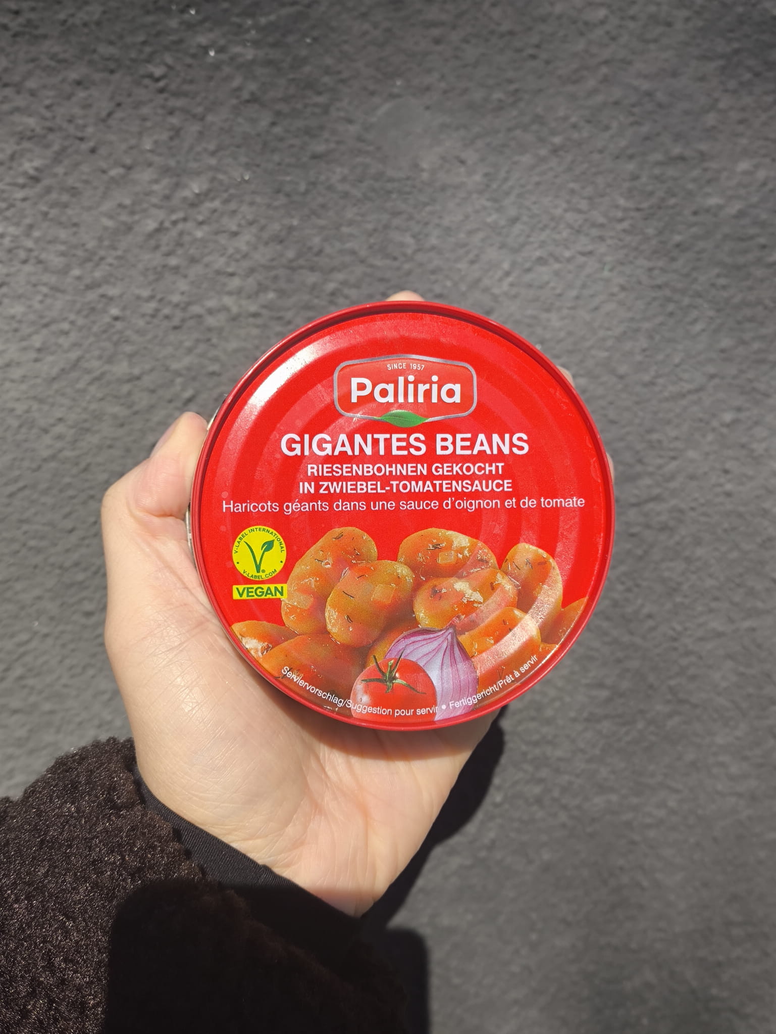 Skład: Olbrzymia fasola gotowana (woda, fasola, przeciwutleniacz: metabisulfit potasu) 64%, sos cebulowo-pomidorowy 29% [woda, cebula, potrójnie zagęszczony koncentrat pomidorowy, obrane pomidory (obrane pomidory, zagęszczony sok pomidorowy, regulator kwasowości: kwas cytrynowy), sól, olej sojowy, koperek, cukier, pietruszka, czerwona papryka, czarny pieprz, ekstrakt z papryki], olej sojowy.