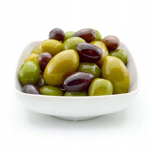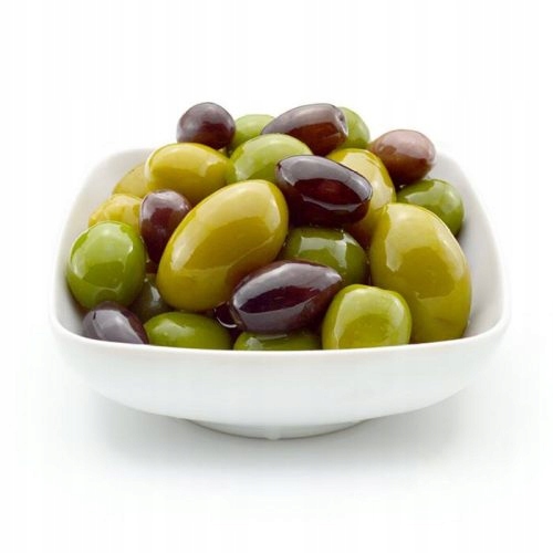 Mix różnych oliwek z pestką (Kalamata, zielonych Chalkidiki, Volos) marynowanych w occie winnym, soli morskiej, wodzie i oliwie z oliwek.
