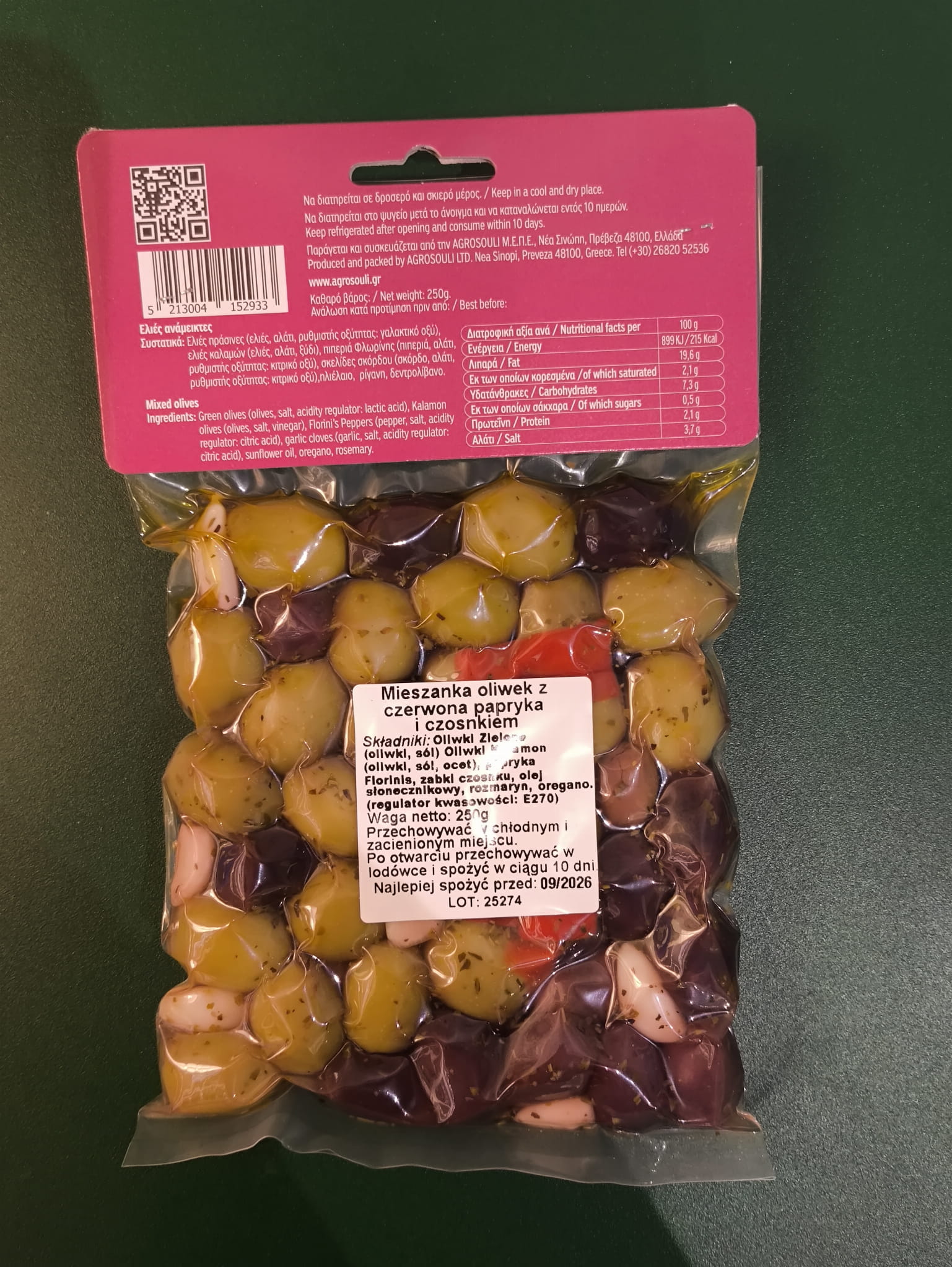 Składniki: Oliwki zielone (oliwki, sól), oliwki Kalamon (oliwki, sól, ocet), papryka Florinis, ząbki czosnku, olej słonecznikowy, rozmaryn, oregano, regulator kwasowości: E270.