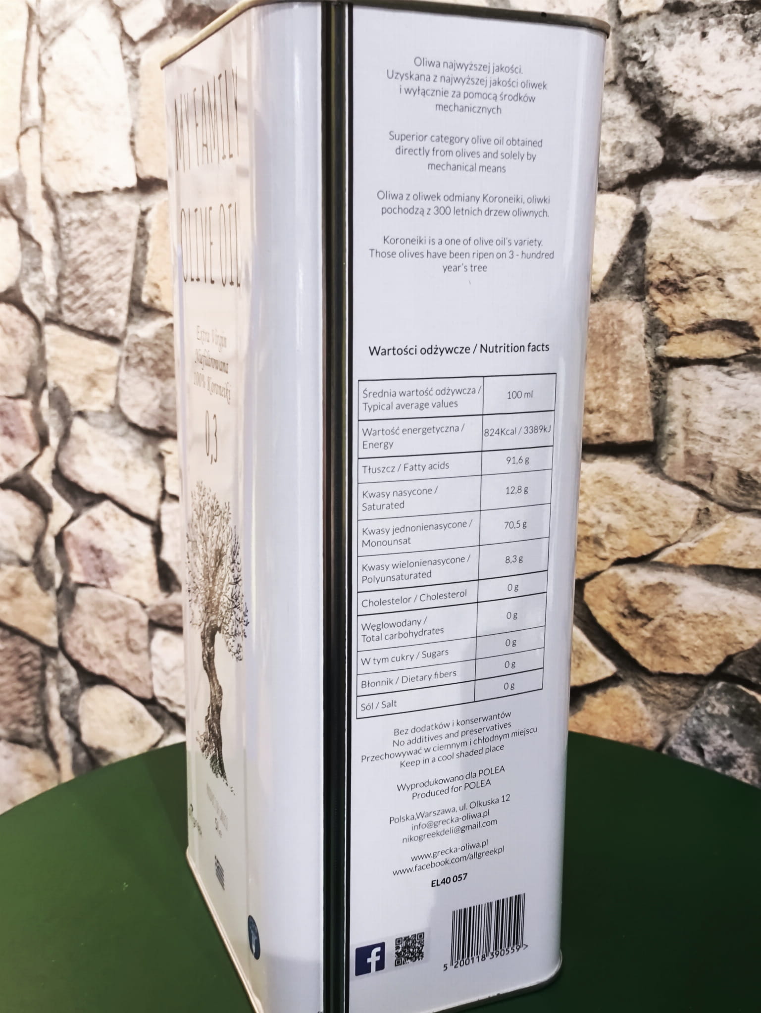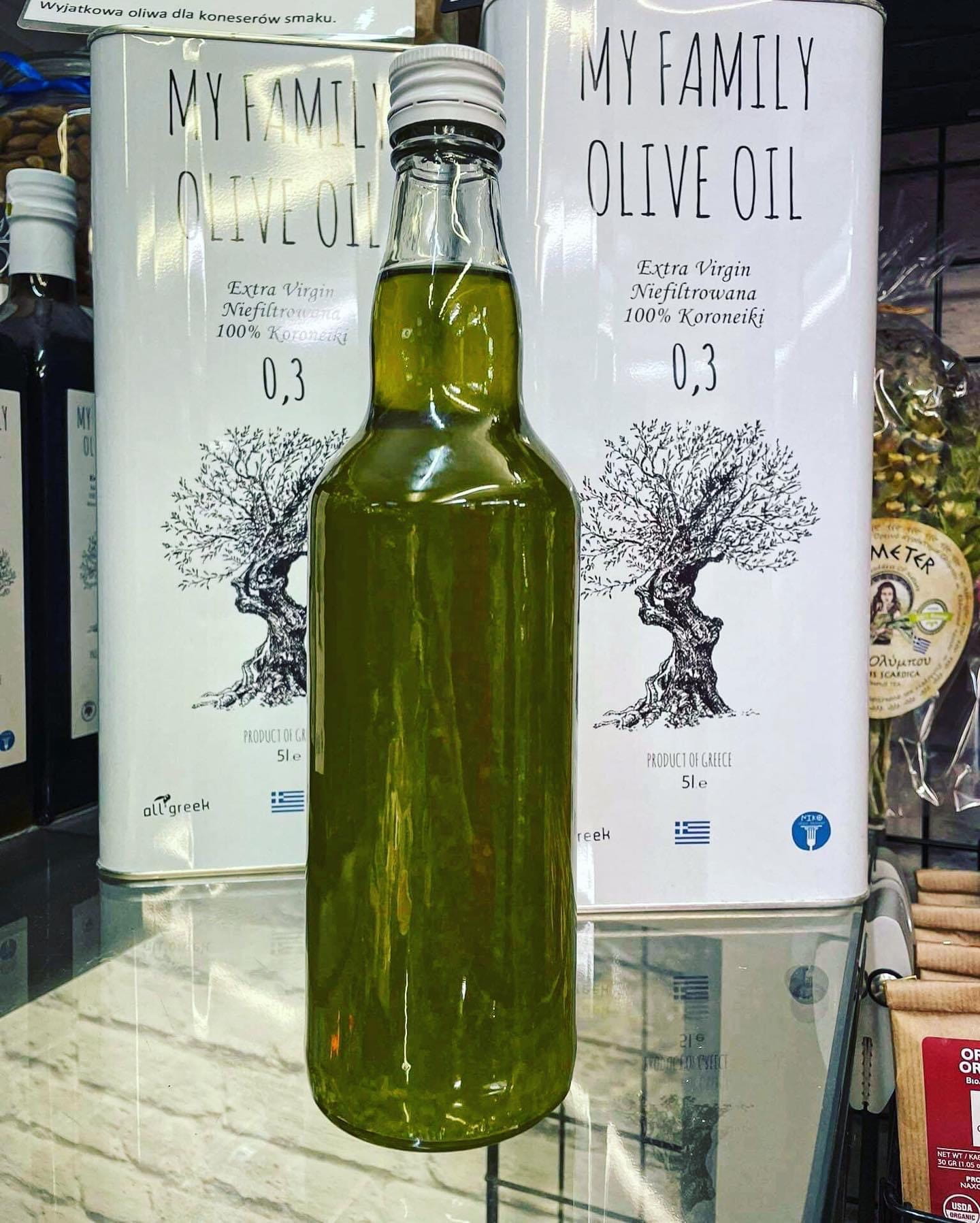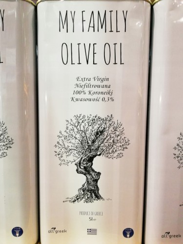 ŚWIEŻA Esencjonalna Oliwa Extra Virgin z własnego gaju w Peloponnese. Niefiltrowana, tłoczona na zimno z najszlachetniejszej odmiany KORONEIKI.