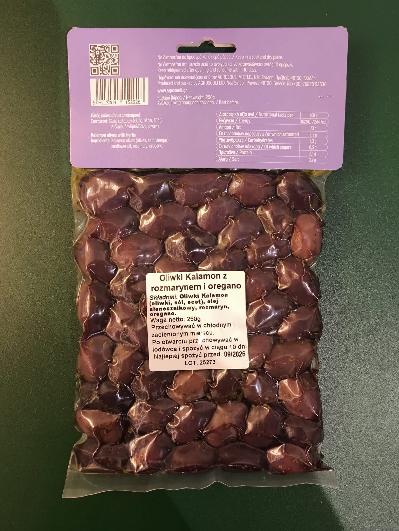 Składniki: Oliwki Kalamon (oliwki, sól, ocet), olej słonecznikowy, rozmaryn, oregano.