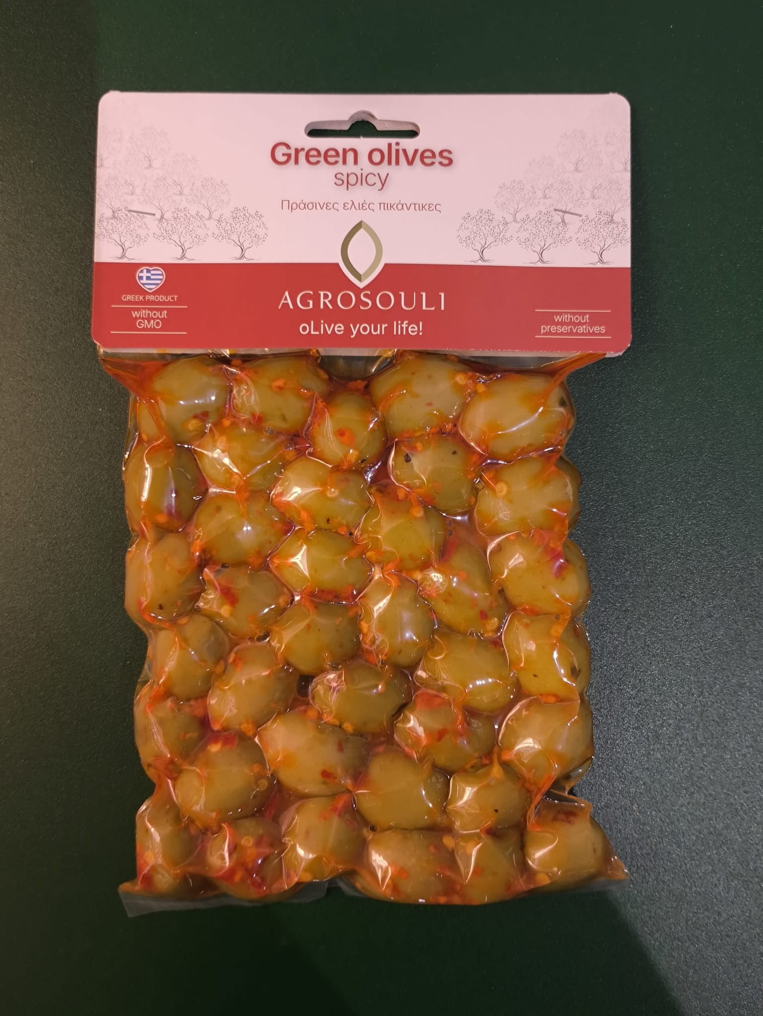 Składniki: Oliwki zielone (oliwki ,sól, regulator kwasowości: E270), olej słonecznikowy, płatki chili.