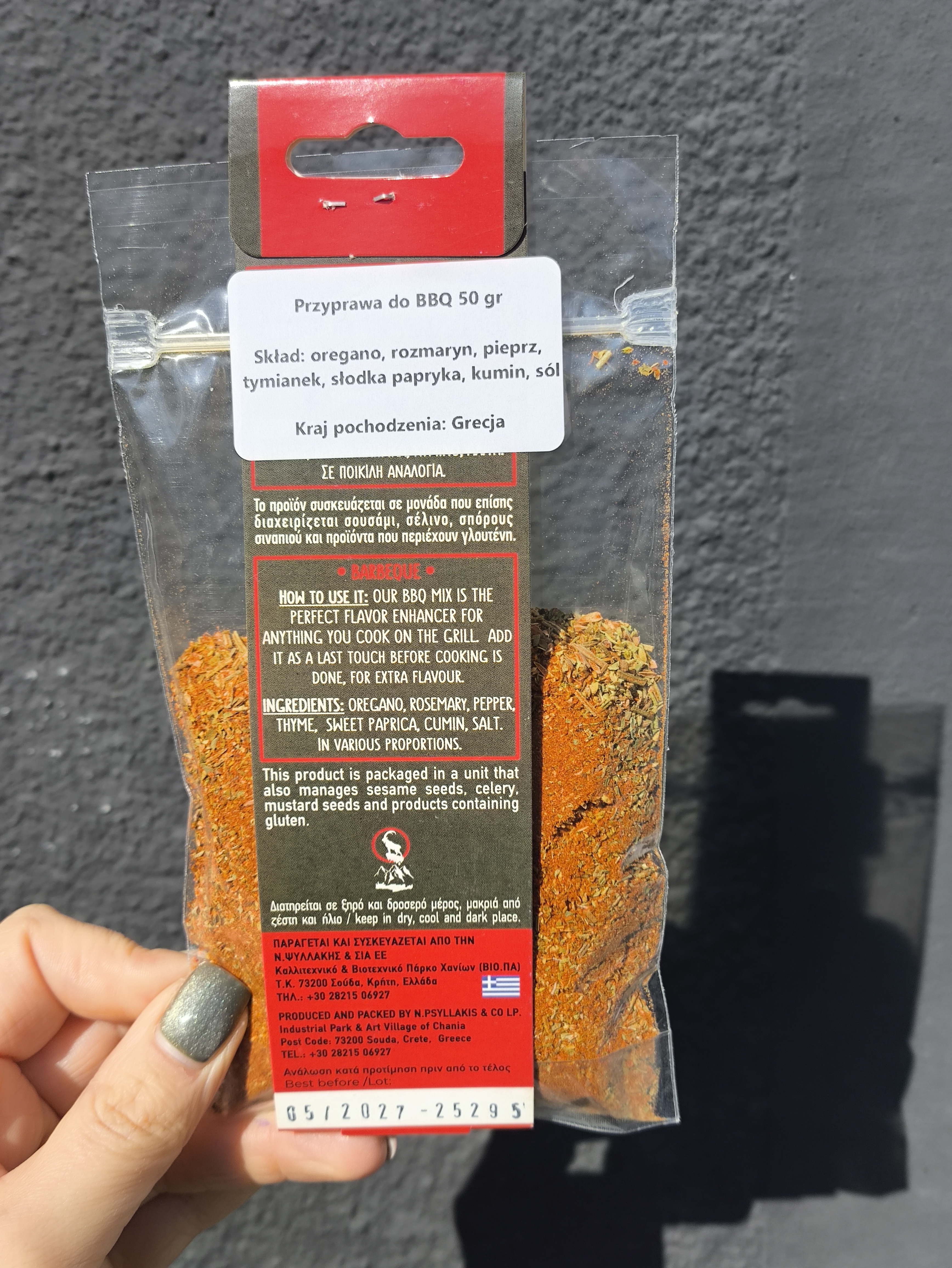 Przyprawa z Krety do BBQ to wyrazista, śródziemnomorska mieszanka stworzona z myślą o miłośnikach grillowania i intensywnych aromatów. Doskonale podkreśla smak mięsa, nadając mu głębi, lekko ziołowego charakteru oraz delikatnej pikantności inspirowanej grecką kuchnią.
